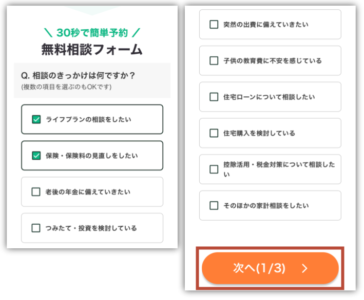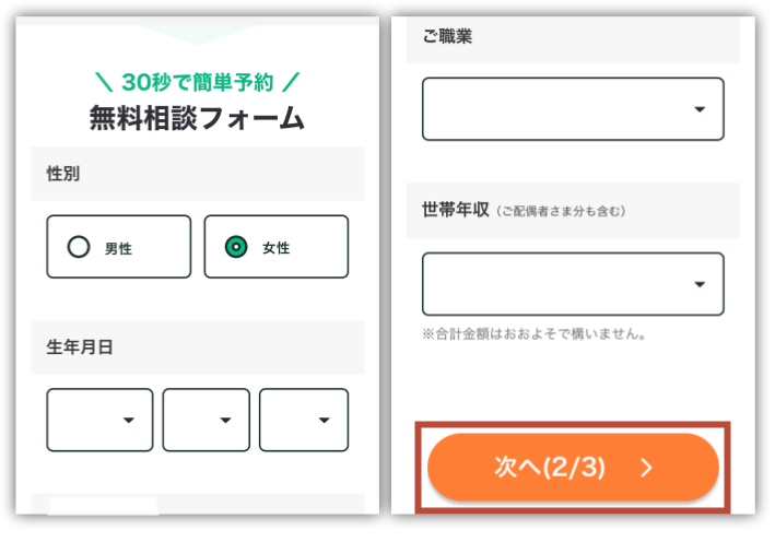 無料相談フォームが開くから、相談のきっかけを選んで「次へ」をタップしてね☺️✨
