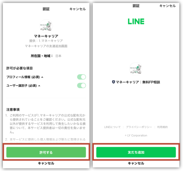 LINEアプリが開いたら、注意事項をチェックして「許可する」をタップしてね。